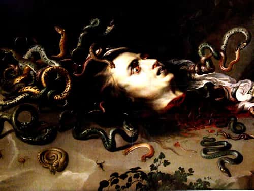 Esta é um monstro terrível: sua cabeleira formada por serpentes embaraçadas, seus dentes compridos e sua língua pendente dão-1he aspecto assustador. Mas, além disso, há coisa muito pior: o olhar de Medusa transforma em pedra todos os que têm a audácia ou a imprudência de olhá-la. Ao mandar Perseu lutar contra a górgona. Polidectes está condenando-o a uma morte certa.